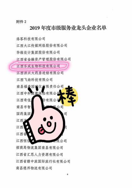 簡介:在2020年3月25日,接南昌市服務(wù)業(yè)發(fā)展領(lǐng)導(dǎo)小組通知,江西樂成生物科技有限公司榮獲“2019年度市級(jí)服務(wù)業(yè)龍頭企業(yè)”稱號(hào)。